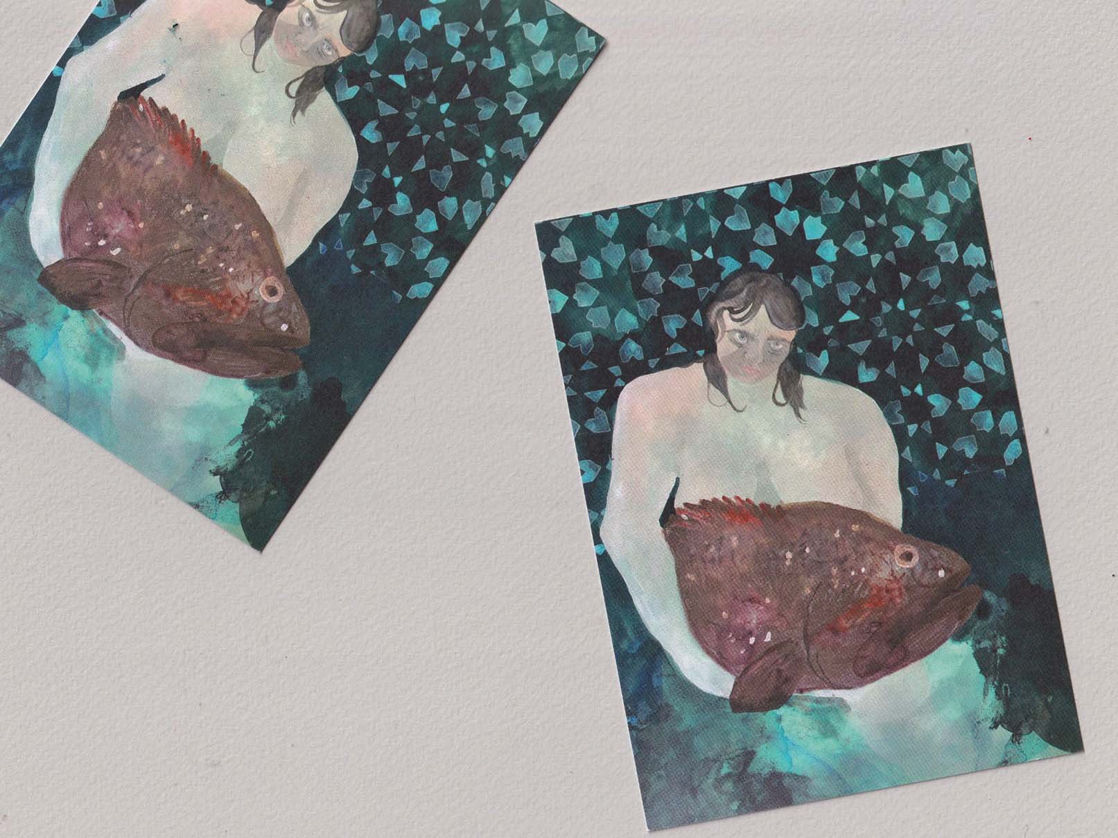 I painted La Pescadora while on a residency in Almería, where it was rumoured that the finca was built with profits from catching grouper in the Mediterranean nearby. Wolfgang Simon was a printmaker, free diver and passionate environmentalist and he often caught the once plentiful fish off the coast. The self portrait is based on a photograph of him, giving my thanks to him for the beautiful home he built that is now an inspiring community of ecologists and creatives, while also acknowledging how we have greatly benefitted from destructive practices, the implications of which we can not truly foresee until it is too late.